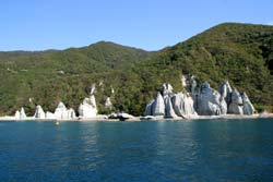 ここから青森までは高速艇で行く。途中に仏ヶ浦が見えるので、初めからデッキに出ようと思っていたら、ダメだというので、仕方なく船内で時間をつぶしていた。すると、「間もなく仏ヶ浦です。デッキに出たい方はどうぞ。」という放送があったので、急いでデッキへ行った。いい場所をとってそれからは写真撮りまくり。