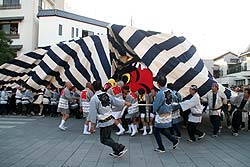 2−2 掛川大祭 11:40〜17:00 バスは予想された混雑もなく順調に走ってお祭り開始前に到着することができた。掛川城の近くの高等学校が臨時の駐車場にバスを止めてそこからは自由行動となった。我々は急いでお祭り会場へ行った。既に多くの人が席を占めていたので、ウロウロして場所を探した。現地の法被を着た人にどこがいいかを聞いて正面の向かい側に敷いてあるシートに入り込んだ。少しするとそのすぐ横の立ち入り禁止の所が解除されて入れるようになったので、その一番前の席をゲット。それぞれの町は、まず鳴り物入りで祭り屋台(山車)を引いてくる。ここまで来るとそれを止めて、正面を向いて出し物を披露する。その都度解説が行われるのでわかりやすい。 1番は獅子舞かんからまち。これは是非見て欲しいといわれていた3つのうちの一つだ。祭り屋台はなくて女の子が花飾りの中に入った物で先導してきた。ゆっくりと歩いてきて、敷かれた畳の上で舞う。これは路上では舞わないという不文律があるのだそうだ。3頭の獅子のうち2頭が雄で1頭の雌を取り合う舞だそうだが、正直よくは分からない。2番の祭り屋台は「功名が辻」の一豊と千代。一時掛川城の城主でもあった2人だ。出し物は奴さん。子どもたちが踊っていた。 3番目の祭り屋台の上には金色の小獅子が2頭乗せられていた。出し物は「ねろてばねろてばねろてばよ〜」のフレーズでお馴染みのかっぽれ。若い衆がかっこよかった。 4番目は祭り屋台の上にも乗せられている神田祭。それと同じ衣装を着た女の子達が、神田祭を踊り、入れ替わって祭り囃子を演奏した。解説にもあったが、この祭は江戸の影響を沢山受けている。だいたい、この出し物を演じている地区が十九首区という地区で、この物騒な名前も、平将門のおもな家来十九人の首をあずかったところ問いことが地名の語源らしい。平将門は神田明神に祀られている。 5番目は祭り屋台ではなく小獅子が入ってきた。小獅子といっても中央会場一杯くらいの大きさがある。中には何人もの人が入って支えているらしい。頭を中心に巻き取るように何度も繰り返された。それまでのまったりした舞と違ってスピード感があって迫力があった。 6番目は奴道中。これも3つのうちの一つだ。一足一足ゆっくりと歩を進めてくる。正面で奴踊りが披露される。これもゆったりしたものだ。持っている物を相手に投げ渡すとき拍手が起こった。7番目は手に手を花笠を持って娘道成寺を踊った。 8番目は若い衆の木遣りくずし。 この頃になると座っている姿勢もつらくなって、また、各出し物のまったり感に少々退屈してきた。その後も、同じような出し物が続いたので尚更のことだ。それらの中から抜き出すとすれば、11番目の桃太郎が、幼稚園児の演技だったので可愛らしかったことと、17番目の浦島が、途中での衣装替えなどもあって楽しめた。そしてとうとう最後、3年に1度しかやらないという今回最大の呼び物、大獅子の番が来た。中央会場から我々の座っている方へ移動するので、ということで場所を動くように言われたが、この頃になると大勢の人で身動きもできないようになっていたので、ずいぶんと無茶なことをするものだ。当然我々は後ろへぐいぐいと押す形になるので後ろの人には気の毒だった。 そうして登場した大獅子だが、小獅子に比べて動きが鈍くあまり感動的なことはなかった。ただ大きいと言うことに価値があるのかも知れない。 これを見終わったのが集合10分前。大急ぎでバスの所へ戻ると殆どの人が集まっていた。最後まで見ていると遅れるからと途中で戻ってきた人が大半のようだ。が、馴染みの人たちはギリギリに戻ってきた。さすがに慣れている。