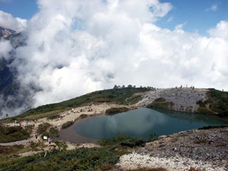 そこからもうすぐに八方池。ただ、以前来たときはぐるりと池の周りを歩けたのに、今回は保護しているということで入れずに、大きく回って休憩場所へ行った。この頃にはもうすっかり雲に覆われてしまって、池に写る白馬三山の姿を期待したのだが、残念ながら、ずっと待っていてもそれは叶わなかった。半袖では寒くなったので、ヤッケを着込んで買い込んできたパンで軽い昼食をとって待っていたが、変わりそうもないので、仕方なく下山することにした。