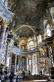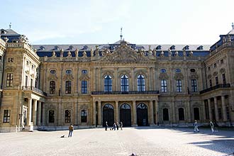 ヴュルツブルグのレジデンス宮殿は1720年から大司教の皇子、カール大帝によって建設が始められた。ベルサイユ宮殿に負けないように対抗心を燃やして豪華に造った宮殿。設計はバルタザール・ノイマン、彫刻はイタリアの彫刻家による。それほどに司教の力というのは絶大だった。平地にこうしたものが造られたということは、世の中が安定してきたということ。この後にゆくマリエンベルク要塞に対して下の宮殿ともいう。