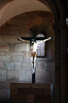 ガイドが鍵を開けて最初に入った部屋。正面にキリストの十字架がある。ここはこの城のプライベートな礼拝堂となっていた場所。薄暗い。
