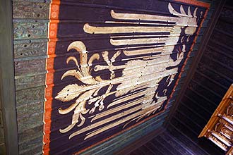 修復中で、何も見られない。かすかに覆われている布を通して豪華な雰囲気が伝わってくる。ここに描かれている絵のレプリカで説明を受ける。1枚は、司教に跪く皇太子の絵、もう1枚は、皇帝になって司教を跪かせる絵。