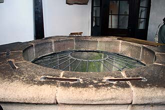 井戸小屋?の中にあり、中は狭いのでここは日本人(つまり我々)は二番目の入場となる。この城は山城なので、高台にあるため、水の確保が大事。井戸を掘った。800年前のもので(城の解説看板では城の出来たごく早い時期)、手堀で10年もかかった。60m?もある深い井戸(城の海抜が350メートルで、水面が366メートルだったので、もう少し浅いかも知れない)。