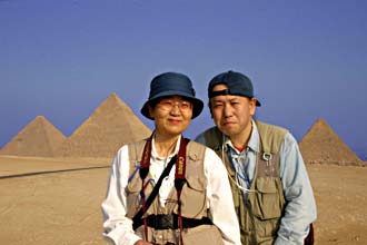 目の前にはクフ王、カフラー王、メンカウラー王のピラミッドがきれいに並んでいる。絵はがきで見るような景色だ。そこで年賀状用の写真を何枚か撮った。