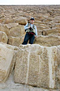 それからクフ王のピラミッドを巻くように歩いていく。と、大きな穴がいくつか見られた。太陽の船があったとされる穴だそうだ。クフ王のものだけなのかと思っていたら、エジプトの思想的なもので結構作られていたらしい。後にも太陽の船のあった穴と思われる・・・といった説明を聞いた。