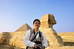 またバスに乗って、最後の見学。スフィンクスは思ったよりも大きく感じた。ピラミッドを背景に堂々としたものだ。近くに寄るには入り口を通らなければならないのだが、三脚を持ち込むのなら、30ポンド払え、それはまた切符売り場で買ってこいという内容のことをもぎりのおじさんに言われた。仕方なく、話の内容がわからないということでとぼけて、三脚を預けることにした。納得してくれたようだった。三脚を持ち込むときには注意した方がよい。
