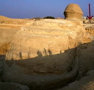 さて、スフィンクスだが鼻がかけてしまったのは残念だったけど、それでも何となく魅力があって引きつけられる。グルリとスフィンクスの横をなめるように見ながら最後尾まで行った。正面の威風堂々とした姿とは違ってお尻が何とも可愛い。一番右の写真の右側にある赤い建物が、昨今有名になった1FがKFCで2Fがピザハット。エジプトでそれぞれrぞれいちばん日本人に有名な店だ。確かにピラミッドの目線にそれはある。