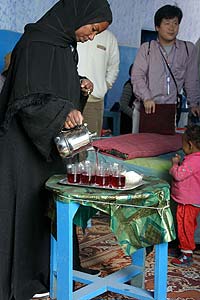 町中へ出てから船をチャーターしてナイル川を渡り、対岸にあるヌビア村へ行った。ここはさほど観光化されていない、本来の村の様子を残していた。ヌビア人はアフリカ人ともエジプト人とも違う人々だ。貧しい印象を受けた。その中の1軒のお宅訪問。応接間のような所へ通されたが、灯りがあるわけでもないので薄暗い。そこでお茶のご馳走を、と言うことになったが、そこでは用意できなかったのか更に奥のお宅へと連れて行かれた。と、そこにはお土産などがあり、少しは観光客が来るようだ。そこで初めてハイビスカスのお茶「カルカデ」を味わった。酸っぱかった。本来はだいたい冷たくして飲むものだが、添乗員氏は心配して熱いものにしてくれた。カルカデを注いだガラスの一つが割れた。ガラスが粗悪品なのだろう。このカルカデ、地元の人はたくさん砂糖を入れて甘くして飲むそうだ。ちなみに、則もそうしてみたが、砂糖を味わっているようだった。