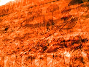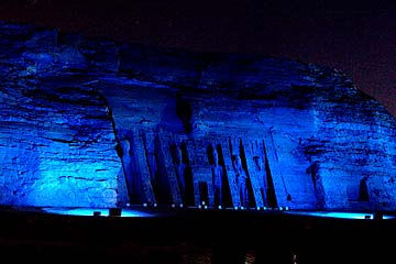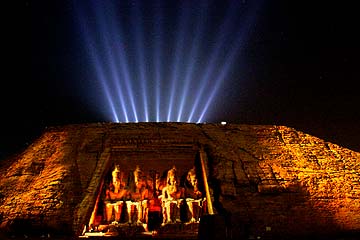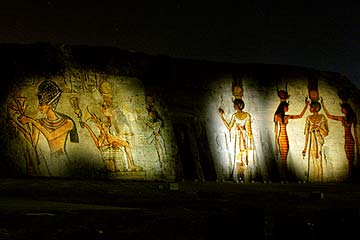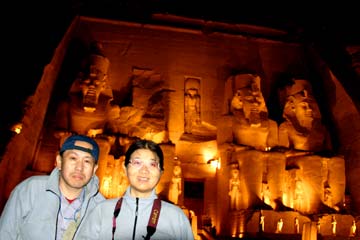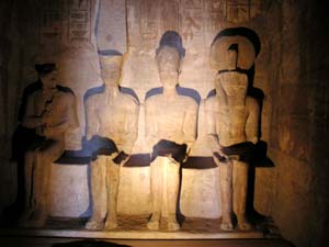 柱像裏には、壁面があり、また右側には小部屋もあって、戦争や捕虜の様子や、写真の様な太陽の船とおぼしきものも描かれておりじつに綺麗であった。一番奥の祠堂にはラムセスと神々の合計4つの像が並んで座っている。夏至と冬至、1年に2度だけ陽が差し込んできてラムセスを照らすのだそうだ。その日はラムセス2世の生まれた日と即位の日だったが、ユニセフのナセル湖水没救出事業で60メートルほど山側に引き上げられた際に、1日ずれてしまって10月21日のはずが22日になってしまったのだそうだ。今から4000年前の人の方が正確に太陽の運航を計算できたというのは、何とも古代人に恥ずかしい限りだ。実際に上の写真でもあるように、その時の様子がわかるライティング(右からラ−神[太陽神]・ラムセス2世・アムン神[テーベの守護神]・プタハ神)で、プタハ神には光が当たらないようになっている心憎い演出。