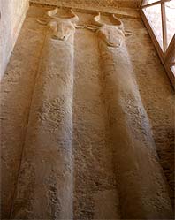 入り口には、ハトホルの雌牛型の像が出迎える。そして入り口から一歩足を踏み入れるとすぐに壁画(レリーフ)の世界に放り込まれる。それも右も左も天井もだ。その壁画は色彩も良く残されていて見応えがある。冒険家ブルースによって、「竪琴弾きの墓」と名付けられる元になったハープ奏者の絵もある。