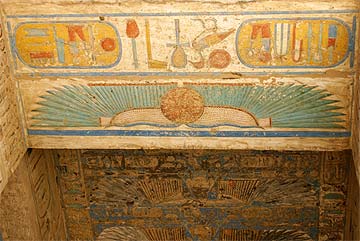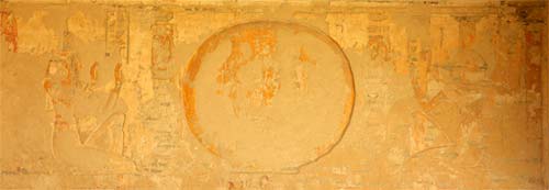 写真で見る下の方の女神が大地を支え、上の女神が天空を支えるという感じと受け取った。そして、下の方の夜の女神の口から食べられ腹の中にある太陽が子宮より再び生まれ昇ってくるという概念を描いたものらしい。これによって、王の命もまた再生されるという概念(思想)を表現しているtらしい。このモチーフは他でも見ることが出来た。