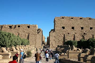 入場するとスフィンクス参道を通って行く。ここのスフィンクスは頭が羊になっている。でも、違和感はない。そこを通って第一塔門をくぐると第一中庭に出る。ここにもスフィンクスがずらりと並んでいる。第二塔門の前にはラムセス2世の像が立っている。「パネジェムの像」と呼ばれるが、ガイド氏によればこれはラムセスだとのこと。