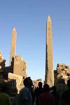 第三塔門を過ぎるとトトメス3世のオベリスクがある。その奥にハトシェプスト女王のオベリスクが見える。これはエジプトに現存するものの中では最大だそうだ。これはいろいろと曰く付きで、元々2本対になって建っていたのだが、1本は折れてしまい、現在そばの「聖なる池」のほとりに横たえられている。そのため、普段は見ることができないてっぺんを見ることができる。残された1本は後にトトメス3世によって覆いで囲われてしまった。おかげで保存状態がいいままで現在に至っている。この2人の争いも面白い。