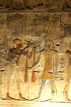 それぞれの聖所に素晴らしいレリーフが残されている。セティ1世を除く6つの葬祭殿の意匠は同じで、6つの部屋とも同じ位置に同じモチーフの絵が描かれている。セティ1世が神に貢ぎ物であるパピルスを渡している場所には、例えば右のラー神の神殿にも左のアモン神の神殿にも同じ位置に同様のモチーフのそれを見ることが出来る。このパピルスの右上には太陽の船が必ず描かれている。