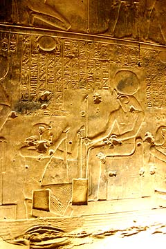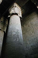 それから神殿の中に入るとハトホルの顔が並んでいる列柱室だ。が、やはり顔はかなり破壊されていてまともなのはほとんど無い。壁にレリーフが残されているが、長くここを住居として使っていたそうで、そのためのススで黒ずんでしまっているのが残念。天井には星座などのレリーフが並んでいるが、黒ずんでいるのと暗くてあまり定かではない。