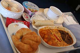 朝食と夕食と2回ほど摂った。スナックのサービスもしてもらった。土産を全く買えなかったので、このスナックを土産にしようと溜め込んでいたら、クルーに見透かされて、「ノープロブレム」とたくさんくれた。旅の恥はかきすてを、文字通り実践してしまった。トホホである。ワインもたくさん飲んでそれから寝て、という過ごし方をした。