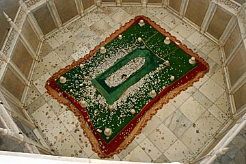 霊廟内部は靴を脱いで入る。内部は八角形になっている。イスラムでは8というのは縁起のよい数字とされているらしい。地下部分(ここも大理石だった)には緑の布が中心に敷かれ、そこに埋葬されているのが分かった。現地の人たちは小銭を投げ入れている。何か御利益があるのだろう。ここでは子供達の一団と遭遇した。激しくホイッスルを引率している人が吹くので、junは教師は何処も同じだと感想を述べる。日本の子どもが鎌倉や奈良京都の寺に社会科見学