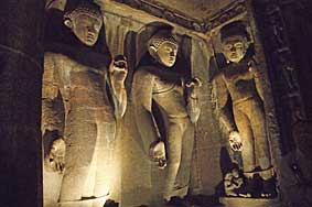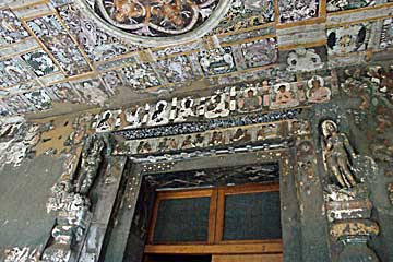 ・第19窟(1006):大きい入口で立派。6世紀の物。中央にはストゥーパがあり、立った仏陀が彫られている。千体仏の壁画など見応えがある。柱にも飛天や仏が描かれている。灯り取りの窓があり、礼拝がしやすいようになっている。明かり取りの窓は、チャイティヤ(塔院)窟には必ずある。