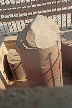柱頭までの長さは15.25mもある物だが、折れて柵の中に収まっている。砂岩で造られているが、磨きが入っているのはこれだけという珍しい物。ここでアショカ王の柱について一寸。アショーカ王(在位:紀元前268年頃 - 紀元前232年頃)は、マウリヤ朝の第3代の王である。アショーカ王の柱、アショーカ・ピラー、アショーカ塔、阿育王塔はアショーカ王が建立したとされる柱あるいは塔。表面にサンスクリット語やギリシャ語が刻まれていることが多く、仏教の歴史の解明にかかせない貴重な資料である。釈迦の生誕の地(ルンビニ)は石柱が発掘されたことから特定された。石柱には、ここがブッダの誕生された地であることと、租税を免除することが書かれていた。これによって、釈迦が伝説上の存在ではなく、歴史上実在したことが認められた。また石柱にはさまざまな文章が書かれているが、現存する仏典と一致しないものも多く、仏教思想の変遷の跡が認められる。また、漢訳の仏典で菩薩に相当する部分が、石柱ではブッダとなっており、大乗の菩薩思想が登場する以前の資料としても注目されている。(以上『ウィキペディア(Wikipedia)』より)