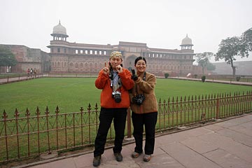 出かけるときに、また、ドアマンさんと記念撮影。最初にアグラ城をめざす。今日の観光にはタージ・マハルが含まれるが、午前中の早い時間帯は霧が立ちこめているので、先に対岸のアグラ城にゆくことになった。