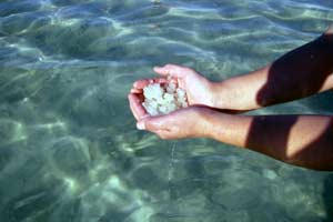 素足のまま入ったが、やはり足が痛くてたまらずビーチサンダルを履いて入ることにした。足下には結晶となった塩のでっかい固まりがごろんごろんしている。でも、ヨルダンの時と違ってその結晶が見える。それだけ水はきれい