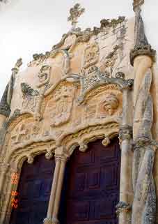 れていたが、図書館から塔のほうへ向かって行くと、ラテン回廊の付け根にはチャペルがある。かつてここは王族の館であったので、プライベートチャペルの様相を持つもので、その王族たちの入り口部分はマニュエル様式の見事なものになっている(写真右)。