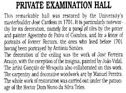 (注釈3・・・ツアー同行のKA様からのご指摘):肖像画は,博士号をとった人ではなく,「コインブラ大学の歴代の学長(1701年までの)」と思います。添乗員の○○さんは,確かに博士号をとった人といいましたが,現地で貰った大学の案内リーフレットには,Rectorとなっていますし(同封のコピー参照),ガイドは,英語でMasterと説明していました。「学長」が正しいと思います。