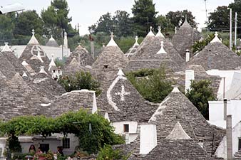 バスの中からちらほらしか見えなかったとんがり屋根の家は、バスから降りて歩き出すと、なんとまわり中とんがり屋根。壮観だ。はじめに「アイア・ピッコラ」地区を歩く。ここは住宅街でとても静か。ゆっくり味わうにはこちらの地区がいいそうだ。壁はどの家も真っ白。こうしておくことがこの地区の男の仕事として割り当てられているらしい。しょっちゅう塗っているようだ。