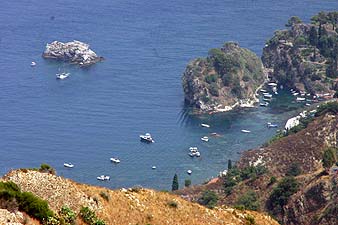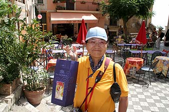 終日タオルミナの観光。ここへは大型バスでは行けないというので、ミニバスに乗って出かけた。タオルミナへ行くまでの道が狭く曲がりくねっているためだ。このバスもタオルミナの入り口のメッシーナ門まで。後は歩いての観光となる。はじめに観光局へ行って地図をもらった。中にはシチリアの飾り馬車とノルマン時代の甲冑を身につけた操り人形が置かれていた。中庭にはアダムとイブの彫刻もあった。昔議会として使われていたのを転用したらしい。